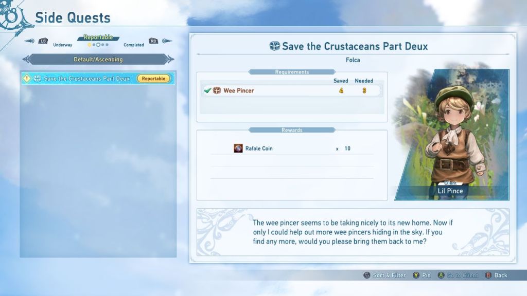 ![]() | Save the Crustaceans 2 | Lil Prince | Find and deliver 3 Wee Pincers to Lil Prince. | 10 Rafale Coins |