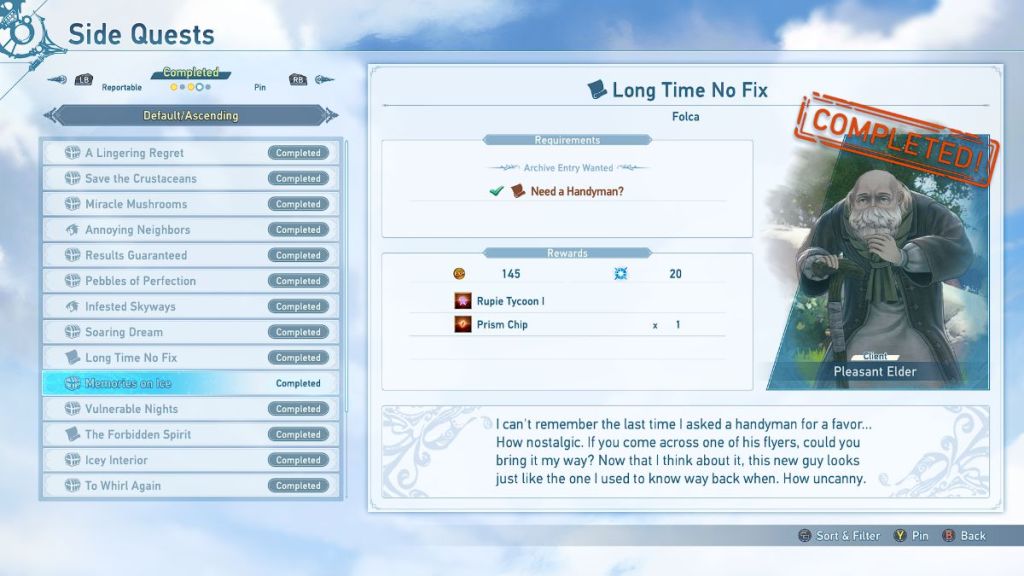 ![]() | Long Time No Fix | Pleasant Elder | Find and deliver the Archive Entry “Need a Handyman?” in the grass near the Pleasant Elder. | 145 Rupies 20 mastery points Rupie Tycoon I 1 Prism Chip |