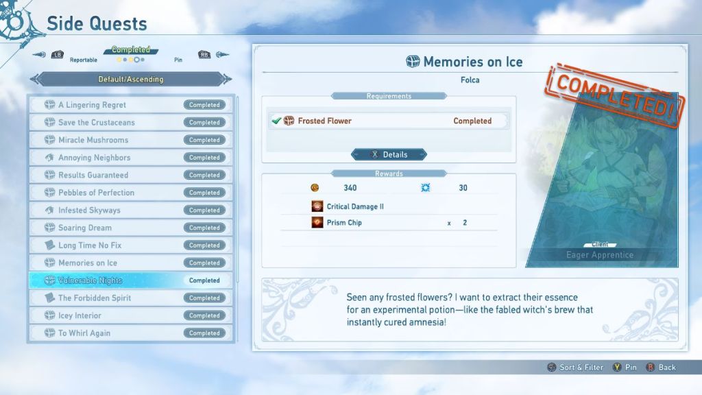 ![]() | Memories on Ice | Eager Apprentice | Find and deliver 3 Frosted Flowers during Chapter 6. | 340 Rupies 30 mastery points Critical Damage II 2 Prism Chip |
