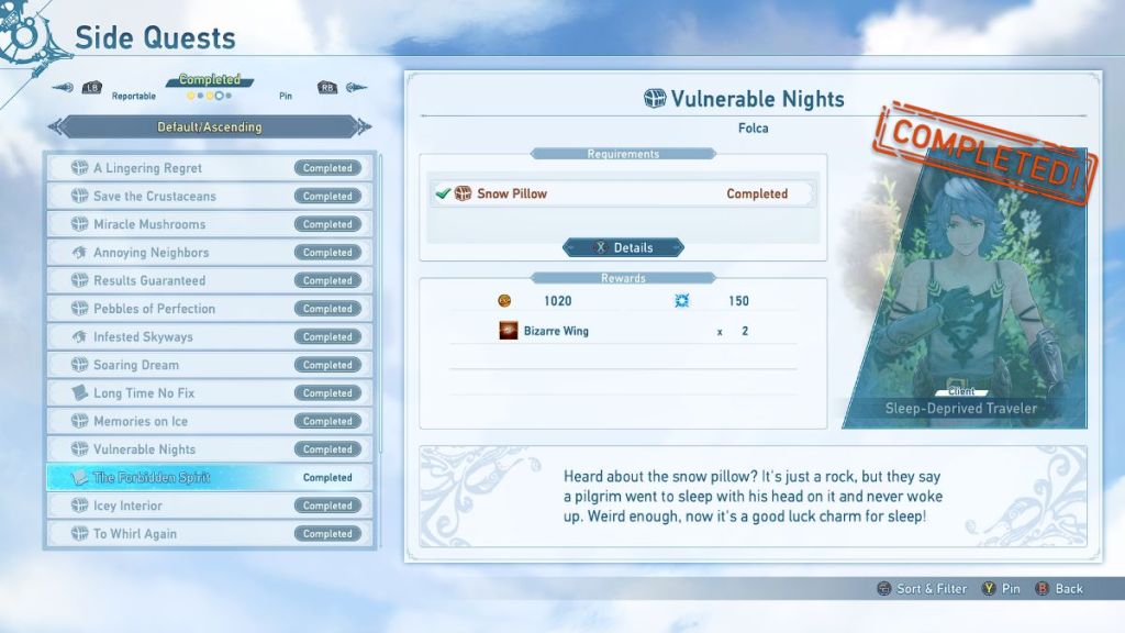 ![]() | Vulnerable Nights | Sleep-Deprived Traveler | Find and deliver 3 Snow Pillows during Chapter 6. | 1020 Rupies 150 mastery points 2 Bizarre Wings |