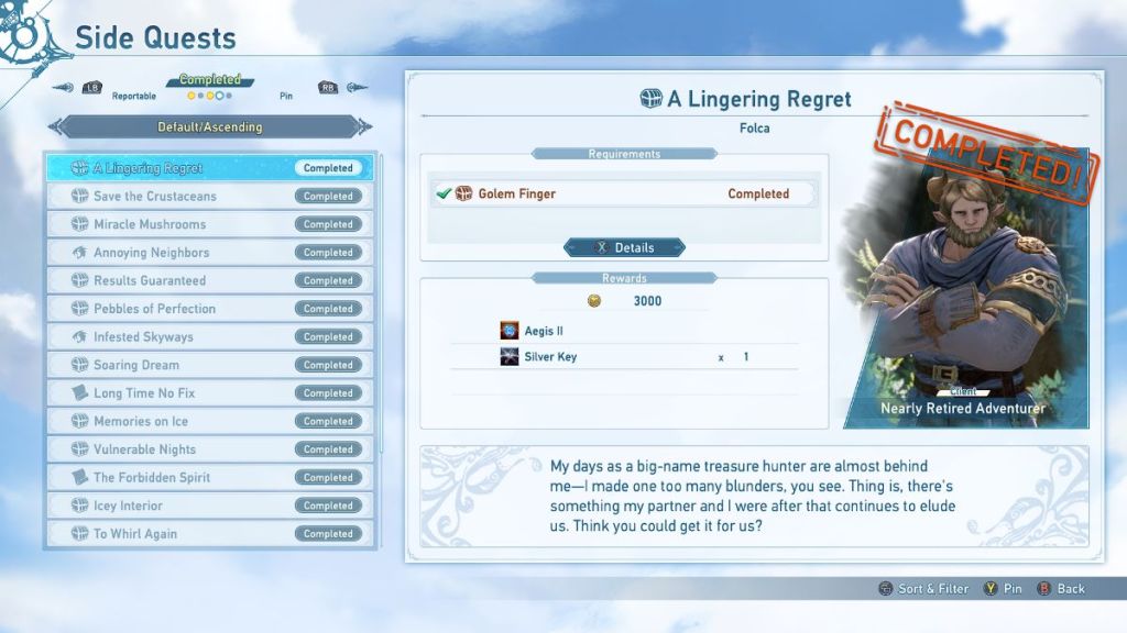 ![]() | A Lingering Regret | Nearly Retired Adventurer | Collect a Golem Finger during Chapter 6. | 3000 Rupies Silver Key Aegis II |