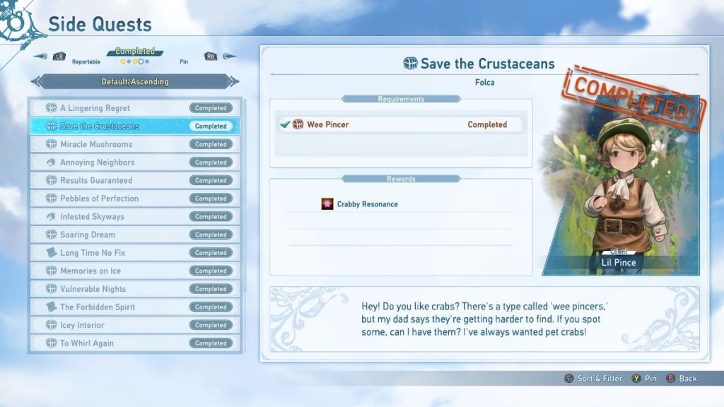 ![]() | Save the Crustaceans | Lil Prince | Find and deliver 1 Wee Pincer to Lil Prince. | Crabby Resonance |