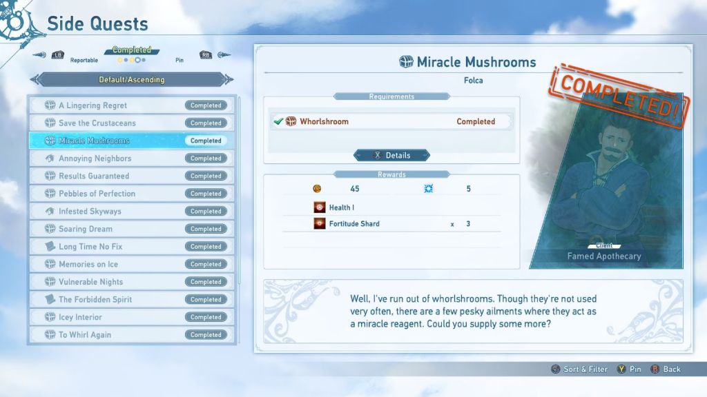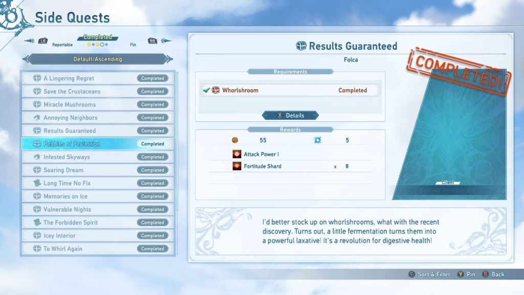 ![]() | Results Guaranteed | Famed Apothecary | Find and deliver 3 Whorlshooms during Chapter 2. | 55 Rupies 5 mastery points Attack Power I 8 Fortitude Shards |