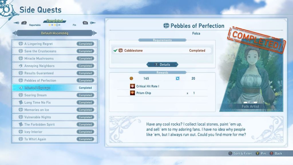 ![]() | Pebbles of Perfection | Folk Artist | Find 5 Cobblestones during Chapter 2 and deliver them to Folk Artist. | 145 Rupies 20 mastery points Critical Hit Rate I 1 Prism Chip |
