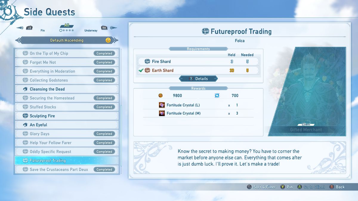 ![]() | Futureproof Trading | Gifted Merchant | Deliver 5 Earth and Fire Shards, which can be obtained from Normal difficulty quests in Dahli and Phondam. | 9800 rupies 700 mastery points Fortitude Crystal (L) 3 Fortitude Crystal (M) (This quest can be farmed to get extra mastery points) |