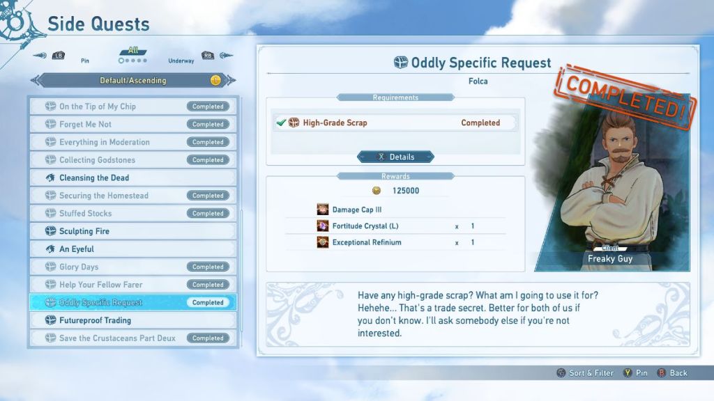 ![]() | Oddly Specific Request | Freaky Guy | 3 High-Grade Scrap, which can be farmed in the Assault Formation quest. | 125000 Rupies Damage Cap III Fortitude Crystal (L) Exceptional Refinium |