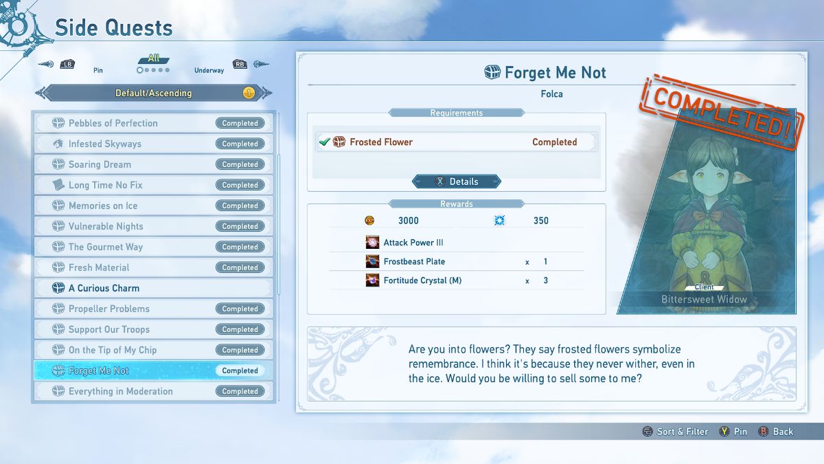 ![]() | Forget Me Not | Bittersweet Widow | Deliver 3 Frosted Flowers, which can be acquired from quests in Leutagne island. | 3000 Rupies 350 mastery points Attack Power III Frostbeast Plate 3 Fortitude Crystal (M) |